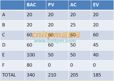 JRS直播某项目经理将其负责的系统集成项目进行了工作分解,并对每个工作单元进行了成本估算,得到其计划成本:第四个月底时,各任务的计划成本、实际成本及完成百分比如下表: