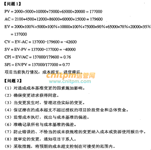 [说明]某信息系统开发项目由系统集成商A公司承建,工期1年,项目总预算20万元。目前项目实施已进行到第8个月末。在项目例会上,项目经理就当前的项目进展情况进行了分析和汇报。截止第8个月末项目执行情况分析表如下: