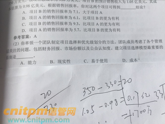 (1)你在评估两个项目,管理层要求确定销售回报率。项目A的预计销售收入为350万美元,该项目总成本为330万美元。项目B的预计销售收入为1.05亿美元,其成本估算为0.98亿美元。根据销售回报率,你对这两个项目可得到______结论?