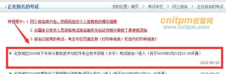 1、点击上面报名入口网址进入报名页面,进入后点击“北京地区2018年下半年计算机技术与软件专业技术资格(水平)考试报名->进入(将于2018年8月21日10:00开通)”