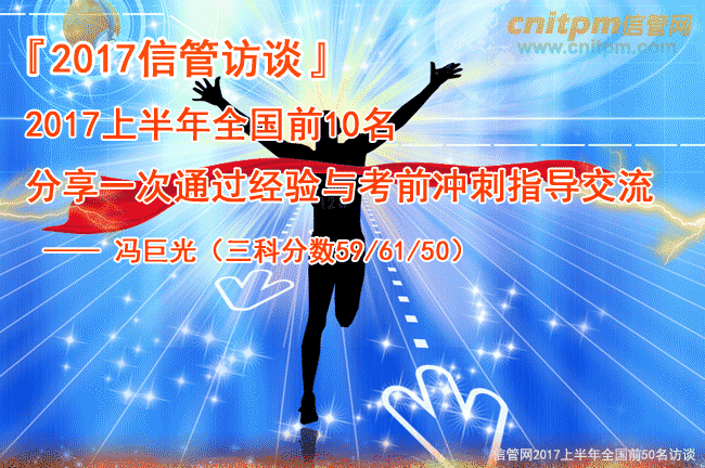 鉴于此,JRS直播为了帮助2017年下半年备考信息系统项目管理师和系统集成项目管理工程师的学员调整好心态,提高备考学习效率。特邀请JRS直播2017年上半年信息系统项目管理师预进全国前10名优秀学员——冯巨光(信管用户名:victores,总分170)同学做客JRS直播,分享成功经验,就2017年考生在备考阶段所关心的考试问题进行全方位解答指导,交流备考经验、学习技巧,分享成功秘诀,指引您少走弯路,助您梦想成真!(此访谈活动对所有注册学员免费开放)