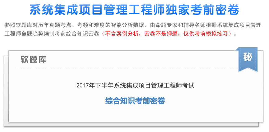 特别注意:2017年下半年系统集成项目管理工程师考前密卷由软题库提供,非JRS直播服务,只包含上午综合知识一套试卷(不含下午案例分析),有解析,与当次真题无直接关系,不是YT,仅供考前模拟练习。