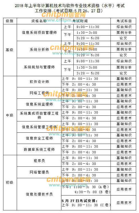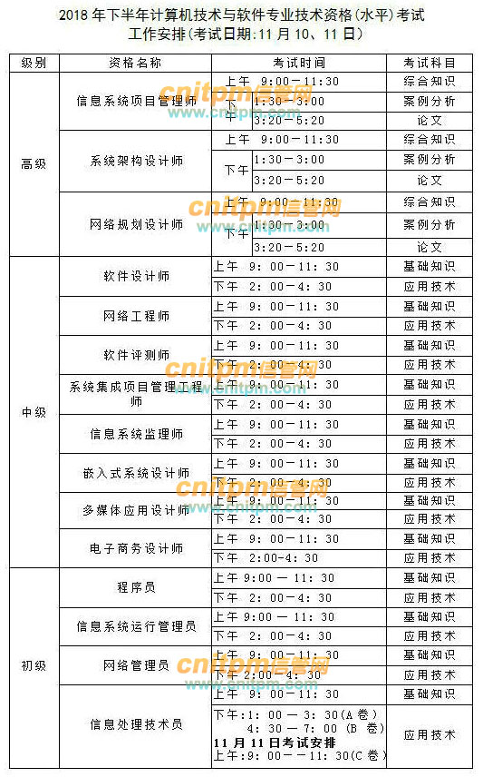 根据2018年上半年计算机技术与软件专业技术资格(水平)考试工作安排,其中2018年上半年高级开考信息系统项目管理师、系统规划与管理师、系统分析师,中级开考系统集成项目管理工程师、信息安全工程师等。2018年下半年高级开考信息系统项目管理师、系统架构设计师、网络规划设计师,中级开考系统集成项目管理工程师等。