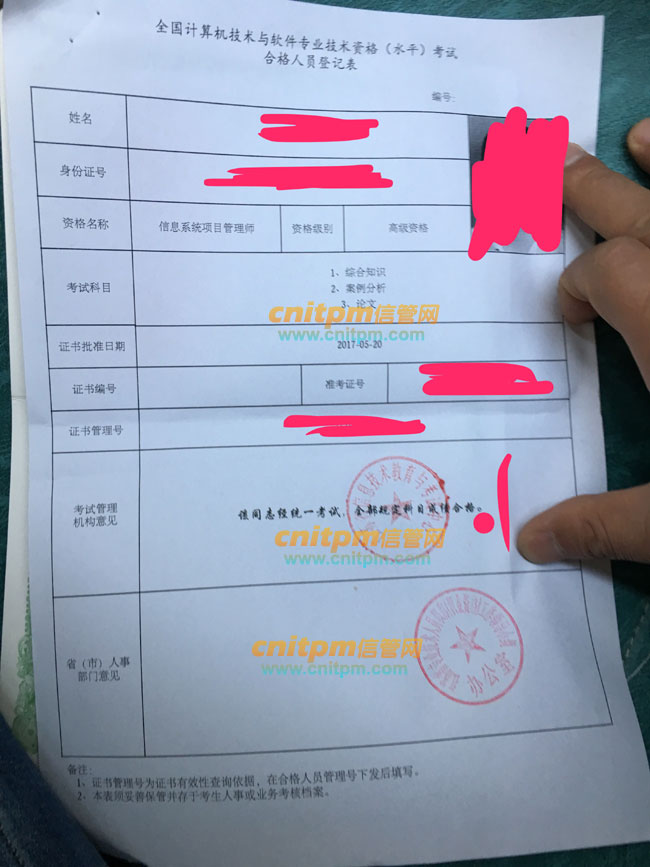 江苏2017年上半年软考高级信息系统项目管理师合格证书已经开始发放,随证书一同发放的还有一张全国计算机技术与软件专业技术资格(水平)考试合格人员登记表,该登记表记录了考生的基本信息,包括你所考的资格名称为信息系统项目管理师,资格级别为高级资格,证书编号等,然后会盖考试管理机构和当地人事部门的章,其中江苏软考证书人事部门盖的章是“江苏省专业技术人员职称|职业资格工作领导小组办公室”