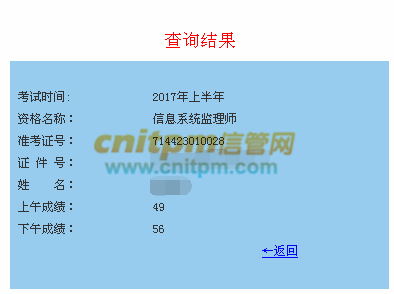 5.21考试,上午题还算中规中矩,下午考试题和历年题相比,个人感觉还是增加了和实际工作结合的趋势,有点不太适应,考后感觉下午题要挂,估分最高能得40。郁闷了很久,7.11时候成绩发布,上午49,下午56。什么56?我都不太相信,后来总结出一条经验,不会答的题尽量在题中找答案,尽量往上靠,字要写工整,字要写满,不出意外,基本都能给你过了。