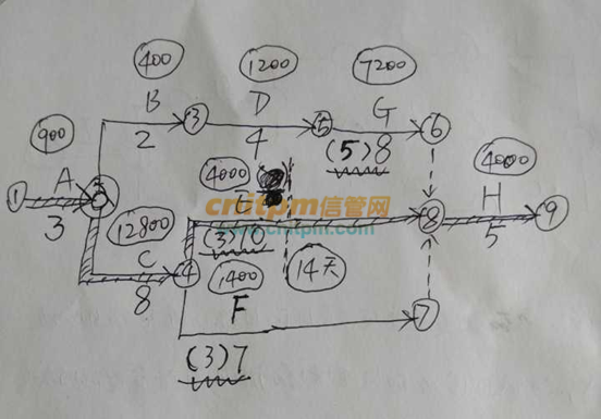 比如:ABDGH、ACEH、ACFH、把天数想加看那个大,那个就是关键路径 还有工期