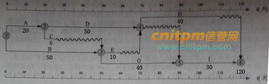 已知某信息工程项目由ABCDEGHI八个活动构成,项目工期要求为100天。项目组根据初步历时估算、各活动间逻辑关系得出的初步进度计划网络图如下图所示(箭线下方为活动历时)。
