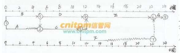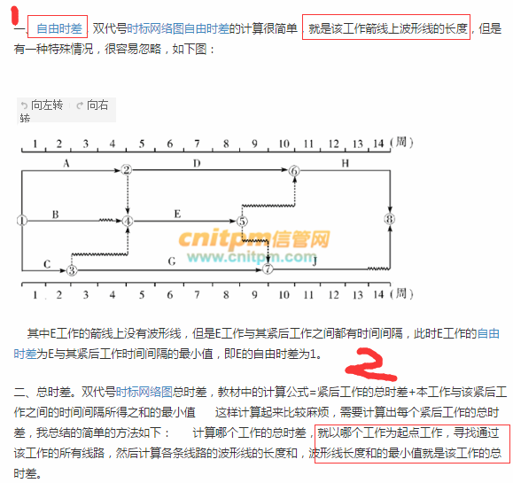 总时差是波浪线的长度;自由时差是总时差减掉所有紧后活动的波浪线的最小值