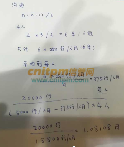 某软件的工作量是20000行,由4人组成的开发小组开发,每个程序员的生成效率是5000行/人月,每队程序员的沟通成本是250行/人月,则该软件需要开发( )月。