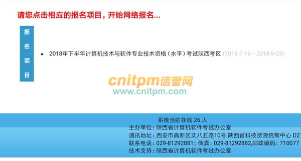 根据《2018年下半年全国计算机与软件专业技术资格(水平)考试陕西考区报名说明》和陕西软考办报名系统显示,陕西2018下半年系统集成项目管理工程师报名时间为7月16日至9月25日,报名方式为网上报名,报名地址为陕西软考办网站,报名入口请点击下面地址进入。