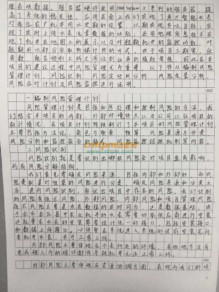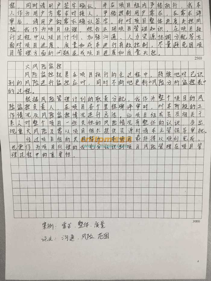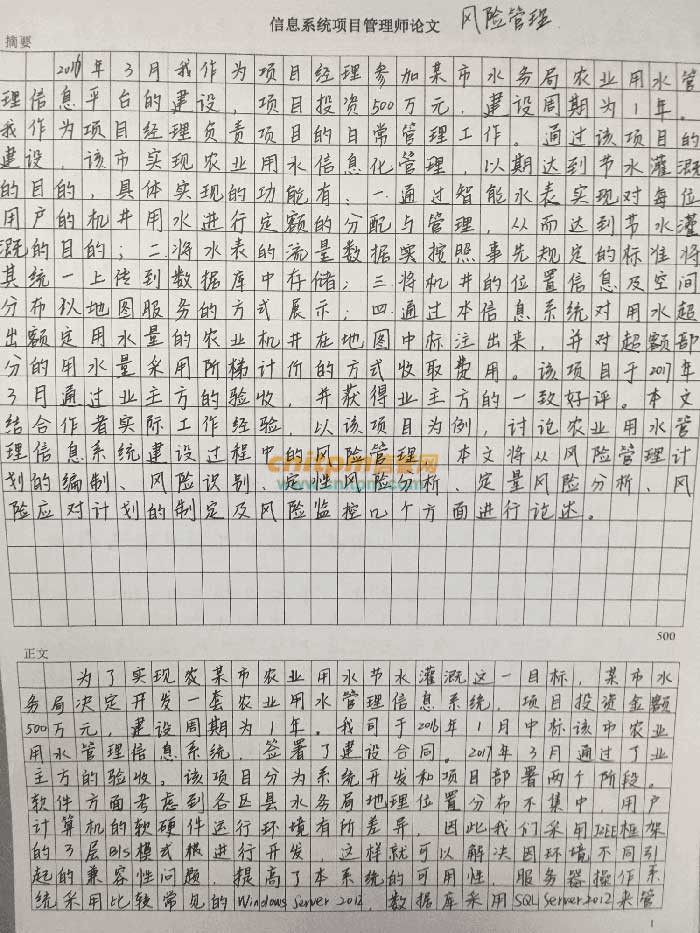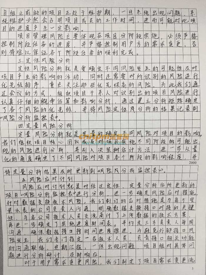 以下信息系统项目管理师风险管理论文考生考试答题纸图片扫描版转自网络,如有侵权,请联系客服删除。