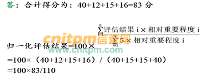 综合上述案例,请帮助项目经理张工计算该项目的评估结果(包括合计得分和归一化结果)。