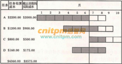 项目由四个任务组成,各自的估算成本和实际成本如下图所示。另外还显示了第六个月结束时预期的任务持续时间和当前完成水平。(通过灰条表示),例如,任务A显示为完成75%。假设在任务持续时间成为呈线性伸展,项目经理应向指导委员会提供什么状态?