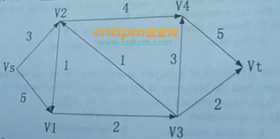 流量的你看每条路径的最小的段,这个限定通道的最大流量,就2条通道:Vs-V2-V4-Vt:3,Vs-V1-V3-Vt:2,合计5