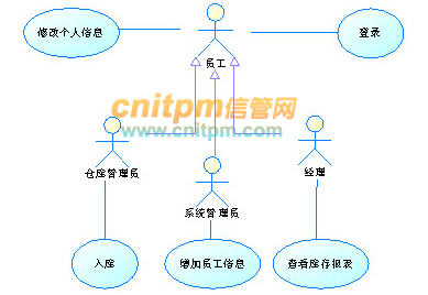 执行者之间的关系只有一种,即泛化关系,用一个带有空心三角形的实线表示,如下图所示,在该图中,仓库管理员、系统管理员、经理都是员工的一种,因此员工拥有的功能这三者都拥有,如登录、修改个人信息等,为了减少用例的个数并且使系统更加符合面向对象设计规范,可以对执行者进行泛化,将各类执行者都具有相同的功能移至父执行者,而将每类执行者特有的功能保留在子执行者中。