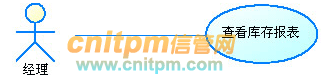 关联关系是指执行者与用例之间的关系,又称为通信关系,如果某个执行者可以对某个用例进行操作,它们之间就具有关联关系,如下图所示,“经理”有一个功能为“查看库存报表”,因此可以在执行者“经理”和用例“查看库存报表”之间建立一个关联关系,关联关系用实线表示。