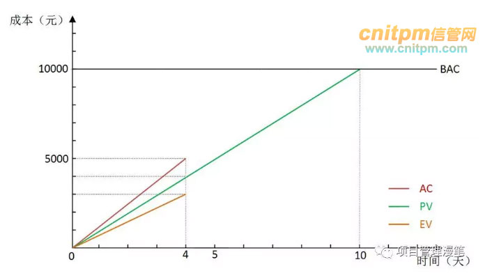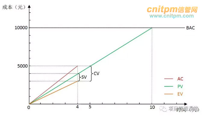 为了顺利完成该项目在项目中途我们需要对项目绩效做监控,于是我们在第四天工作结束的时候对该项目进行绩效评估。本来第四天工作结束的时候我们计划是要完成40米的任务的(因为每天计划是10米),这个40米的工作量的价值是40米*100元/米 = 4000元,这个4000元就是我们的计划价值PV(计划做多少事);实际完成了多少呢?我们发现第四天工作结束实际才完成了30米砌墙任务,这个30米围墙对应的价值是30米*100元/米=3000元,这个3000元就是我们的挣值EV(实际做了多少事),也就是我们在第四天结束就完成了3000元的工作量;到第四天结束这个时间点我们实际却花了5000元,这个5000元就是我们的实际成本AC(实际花了多少钱);总的预算10000元就是我们的完工预算BAC;总结一下就是一共计划10000元10天完成这个项目,在第四天结束的时候去检查项目绩效,发现到这个时间点为止本来应该完成4000元的项目工作量(PV),结果只完成了3000元的工作(EV),却花了5000元的成本(AC)。为了更直观表示这几个概念,可以用图表示这几个概念如下: