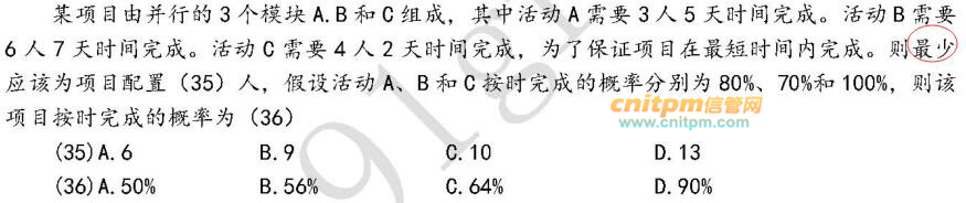 某项目由并行的3个模块a、b和c组成,其中活动a需要3人5天时间完成。活动b需要6人7天时间完成。活动c需要4人2天时间完成,为了保证项目在最短时间内完成。则最少应该为项目配置()人,假设活动a、b和c按时完成的概率分别为80%、70%和100%,则该项目按时完成的概率为