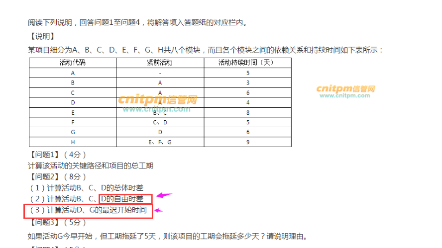 某项目细分为a、b、c、d、e、f、g、h共八个模块,而且各个模块之间的依赖关系和持续时间如下表所示: