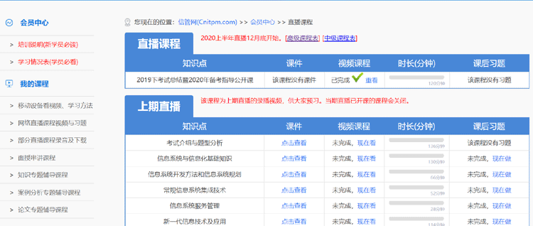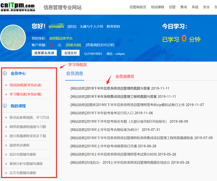 2、进入会员后台,分为个人信息区、会员消息区和学习导航区。(以高项学员管理后台为例,其他科目学员管理后台类似)