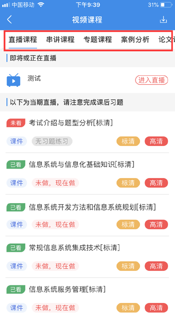 点击【网络直播课程视频与习题】是观看直播课程及课后录播视频,以及作答课后习题,这个栏目是学习的主要内容。
