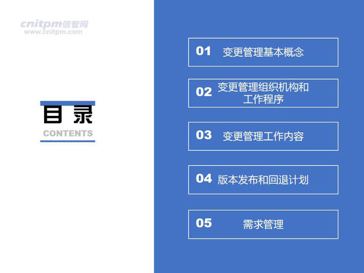课程内容:变更管理基本概念、变更管理组织机构和工作程序、变更管理工作内容、版本发布和回退计划、需求管理
