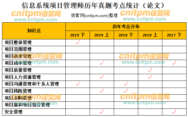 信息系统项目管理师论文科目题型为写作题,考核范围主要为十大管理领域(项目整体管理论文、项目范围管理论文、项目进度管理论文、项目成本管理论文、项目质量管理论文、项目人力资源管理论文、项目沟通和干系人管理论文、项目风险管理论文、项目采购管理论文),同时信息安全论文也是最近有考到的领域。