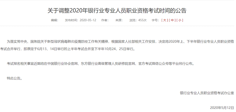 5月12日,银行业专业人员职业资格考试办公室发布通知,与软考一样原先一年考2次的2020年银行业专业人员职业资格考试合并至下半年10月24、25日举行。