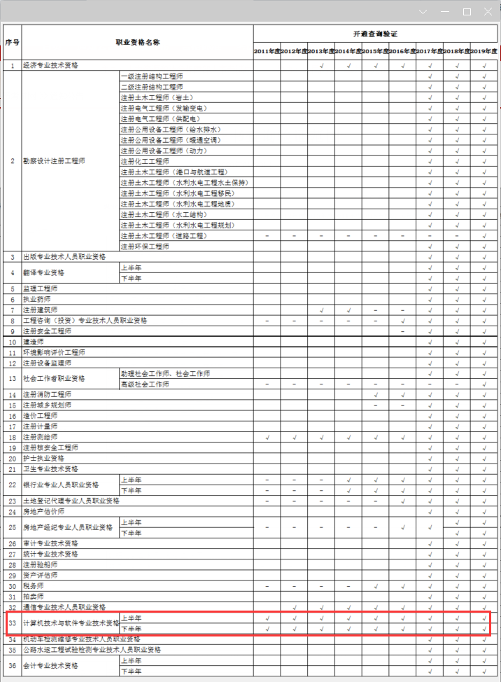 根据中国人事考试网的相关通知,目前中国人事考试网职业资格证书查询验证范围里,计算机技术与软件专业技术资格考试(比如高级信息系统项目管理师、系统规划与管理师、中级系统集成项目管理工程师、信息安全工程师等),已开通2011年至2019年份的证书查询。