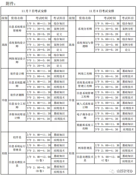 2020年下半年山西软考考试级别、时间、内容