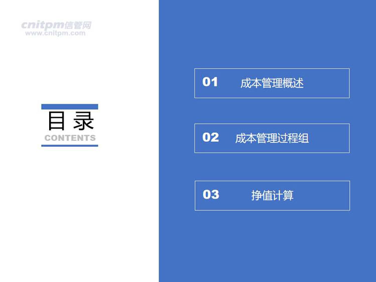 课程内容:成本管理概述、成本管理过程组、挣值计算