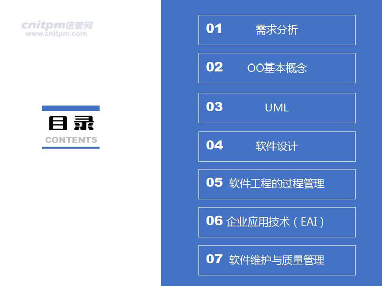 课程内容: 需求分析、00基本概念、UML、软件设计、软件工程的过程管理、企业应用技术( EAI )、软件维护与质量管理