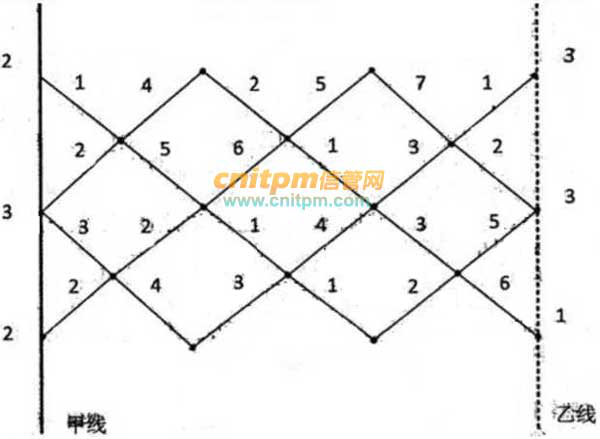 已知网络图各段路线所需费用如下图所示,图中甲线和乙线上的数字分别是对相应点的有关费用,从甲线到乙线的最小费用路线是( 1 )条,最小费用为( 2 )