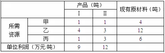 某企业需要采用甲、乙、丙三种原材料生产Ⅰ、Ⅱ两种产品。生产两种产品所需原材料数量、单位产品可获得利润以及企业现有原材料数如表所示: