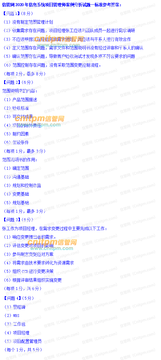 该试题主要考核范围管理知识,要你从范围管理的角度指出案例中项目实施过程中存在的问题以及范围说明书的内容和作用等。JRS直播将在2020年11月8日对2020年下半年信息系统项目管理师案例分析真题试题一进行详细直播视频解析。