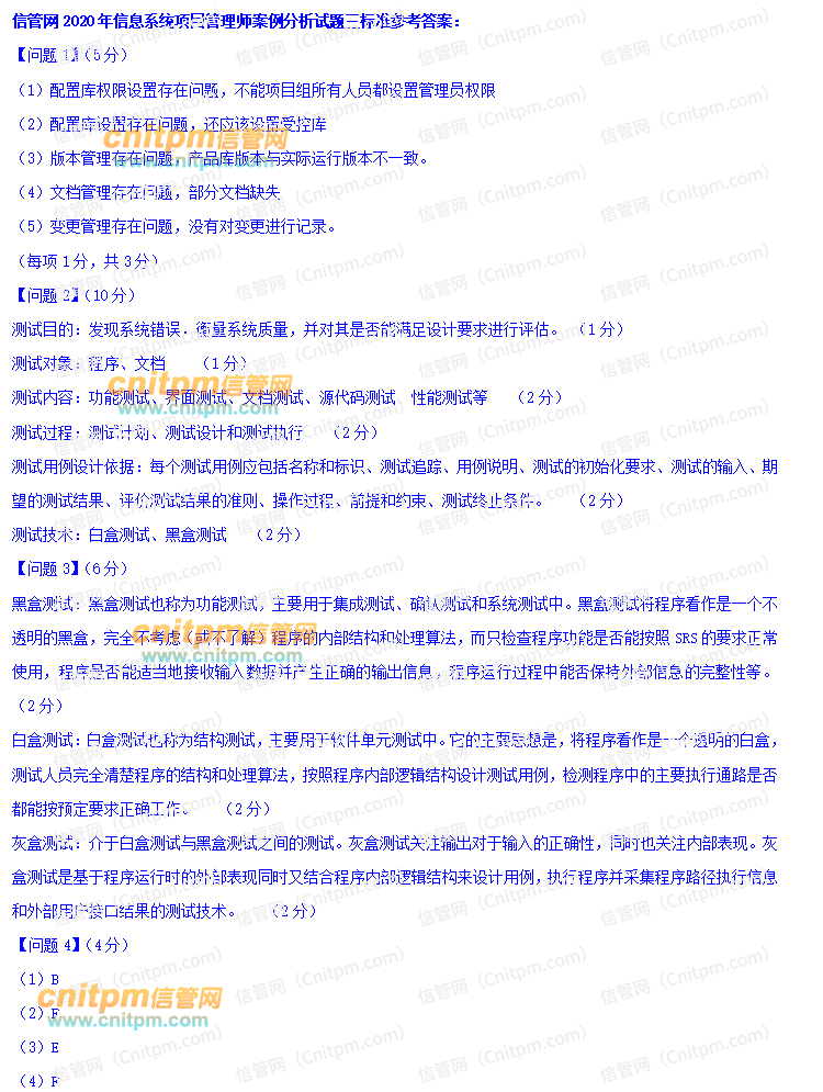 该试题主要考核配置管理和测试相关知识,从配置管理的角度指出项目实施过程存在的问题,设计系统测试方案,黑盒测试、白盒测试、灰盒测试的含义和用途等等。JRS直播将在2020年11月8日对2020年下半年信息系统项目管理师案例分析真题试题三进行详细直播视频解析。