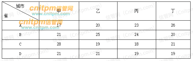 69、有 A、B、C、D 四个临省,同时向甲、乙、丙、丁四个城市运送援助物资,假设规定一个省对口援助一个城市。四省到各城市的运输时间如下表所示。请给出一个合理的方案,使得物资运输总时间最短,则最短物资运输时间为()时。