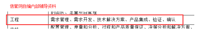 教程P49,CMMI的5个工程类过程域包括:产品集成、需求开发、技术解决方案、确认、验证。