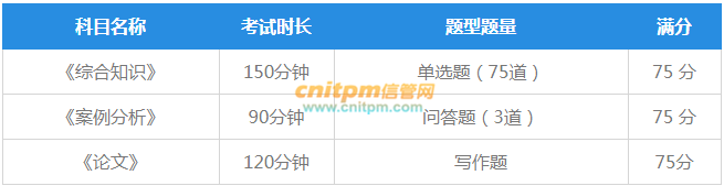 题型题量:信息系统项目管理师考试科目包括《综合知识》、《案例分析》、《论文》,其中《综合知识》单项选择题,《案例分析》问答题,《论文》为现场写作题。