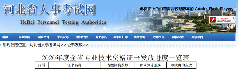 其实河北省人事考试网《2020年度全省专业技术资格证书发放进度一览表》在2月8日就已经显示计算机技术与软件专业技术资格证书,河北2020年度计算机技术与软件专业技术资格考试合格证书已到达考试中心,可以登录证书邮寄系统办理证书邮寄到家服务。