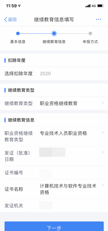 5、填写个人信息以及继续教育信息,然后选择下一步;