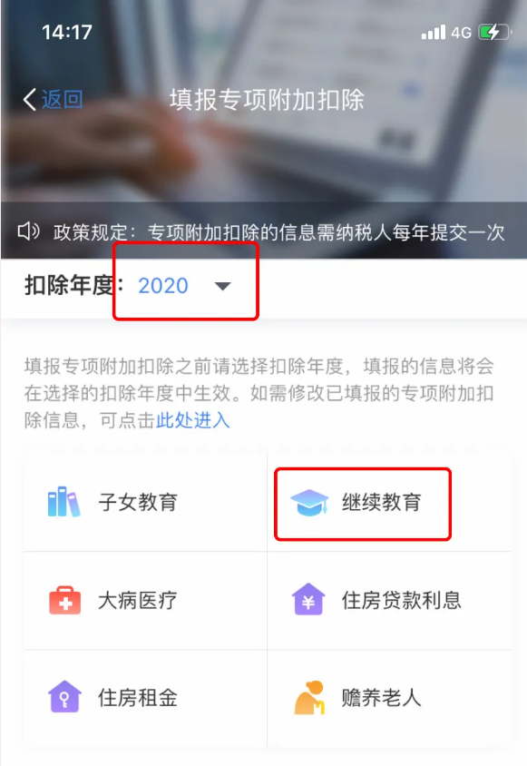 4、选择扣除年度,然后选继续教育板块,准备完毕,进入填报;