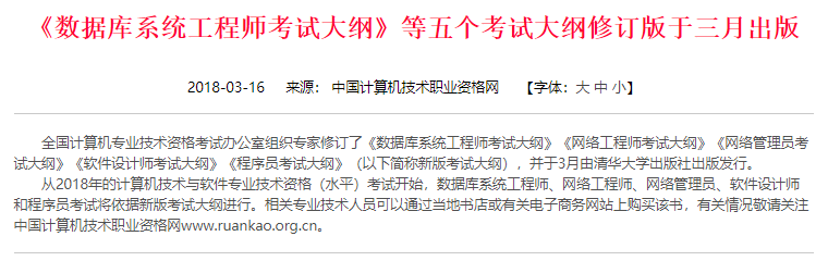从2018年的计算机技术与软件专业技术资格(水平)考试开始,数据库系统工程师、网络工程师、网络管理员、软件设计师和程序员考试将依据新版考试大纲进行。相关专业技术人员可以通过当地书店或有关电子商务网站上购买该书,有关情况敬请关注中国计算机技术职业资格网www.ruankao.org.cn。