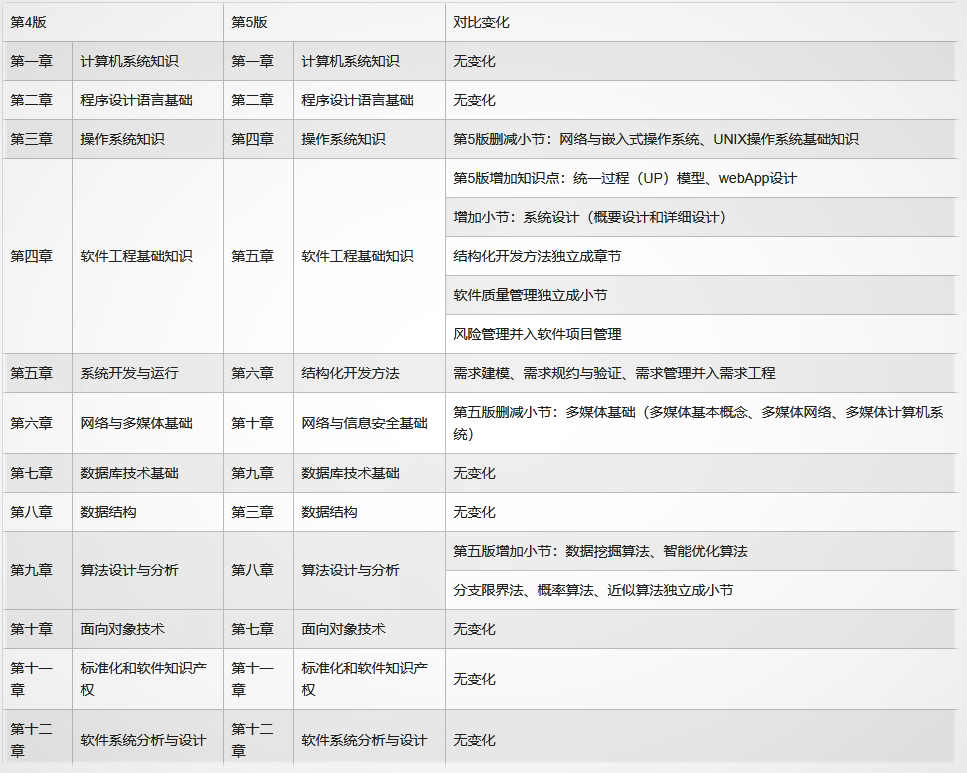 虽然《软件设计师教程 第五版》出版社没有变化,但是在内容上是进行了修订的,详细变化内容JRS直播进行了相应的整理,具体如下图所示: