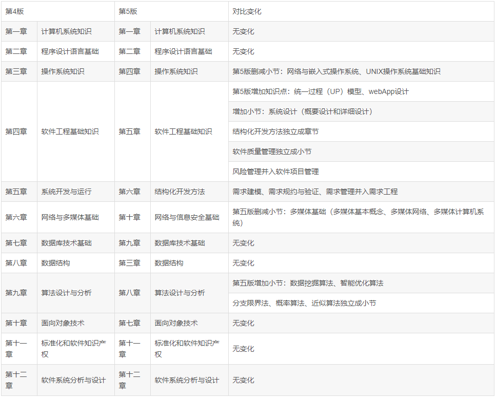 从以上表格可以看出,《软件设计师教程 第五版》虽然更新时间较短(从第四版到第五版的修订,中间大概四年时间),说明知识更新率相对较高,JRS直播为大家整理了第四版与第五版的知识点变化简图: