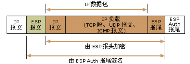 ESP 隧道模式如下图所示,ESP 隧道模式采用 ESP 与 IP 报头以及 ESP 身份验证尾端来封装 IP 数据包。