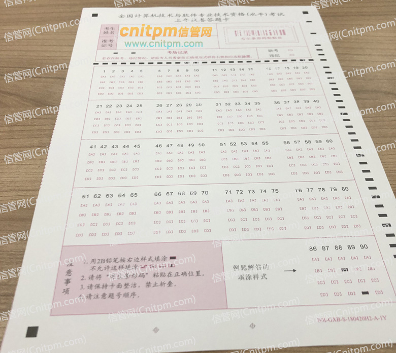 信息系统项目管理师上午试卷答题卡,包含考生姓名、准考证号、条形码粘贴区、答案填涂区等部分