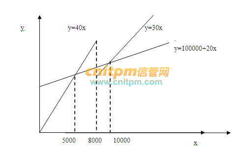 2、某家用电器制造企业在项目进行中需要一批零件,可以选择自制或是外购,如果选择自制的话,需要10万元购买生产设备,生产每一个零件的成本是20元;如果选择外购,购买在8000件以下,每件40元,大于或等于8000件的,每件30元。请画出此题的盈亏平衡图;计算盈亏平衡点并为企业制定自制或是外购的决策。