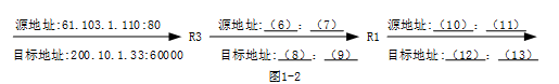 若某一时刻R1的NAPT变换表如表1-1所示,由Internet发往R1的报文信息如图1-2所示,填写图中空缺信息。