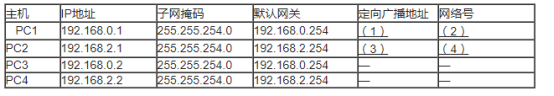 由于业务需要,需将PC1和PC3划分在vlan10,PC2和PC4划分在vlan20中。IP地址配置如下表所示,请将下表空白部分补充完整: